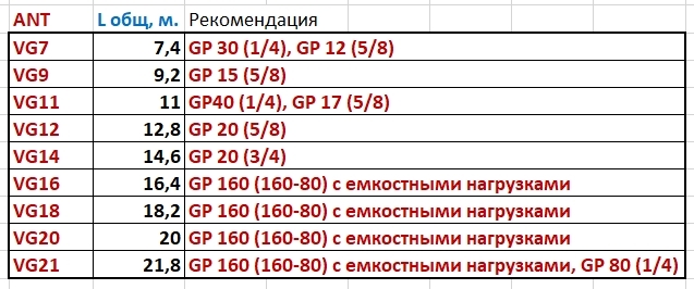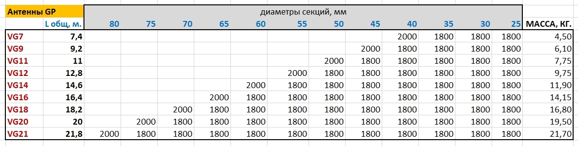 Структура антенн по диаметрам и длинам секций: